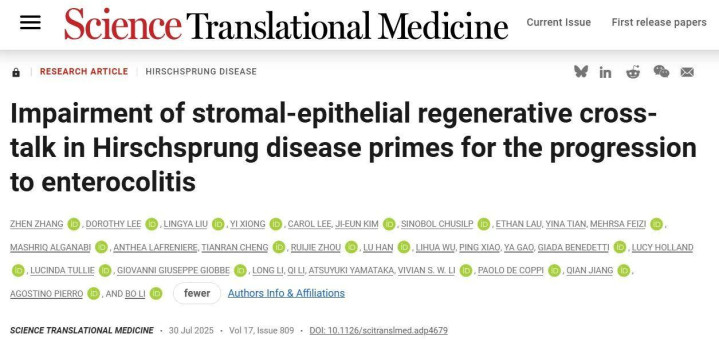 2025年7月30日,首都儿科研究所遗传学研究室姜茜研究员及首都医科大学附属首都儿童医学中心普通外科李颀主任医师团队与加拿大多伦多病童医院合作,在国际知名期刊《ScienceTranslationalMedicine》在线发表了题为"Impairmentofstromal-epithelialregenerativecrosstalkinHirschsprungdiseaseprimesfortheprogressiontoenterocolitis"的封面研究论文,首次报道了MMP1+促炎基质细胞特异性抑制剂布洛芬在治疗先天性巨结肠相关性小肠结肠炎中的潜在应用价值。