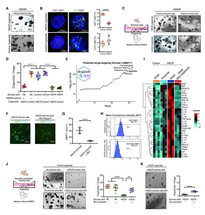 肠上皮的生存、再生能力取决于肠组织内不同类型细胞之间的协调相互作用。为了验证基质细胞4亚群对结肠上皮再生缺陷的贡献,研究者构建了体外细胞-类器官共培养模型。实验证实来自HSCR患者远端扩张肠段的基质细胞不能有效维持来自健康对照组的结肠类器官生长;而来自健康供体的基质细胞则可以有效纠正HSCR患者的体外培养类器官生长受损。利用在线药物筛选模型drug2cell,研究者发现布洛芬(ibuprofen,Ibu)是具有特异性抑制基质4细胞亚群功能的最佳候选药物,体外细胞培养及干预实验均证实Ibu可通过降低MMP1表达水平、减少炎性细胞因子的表达发挥抑炎作用,经过Ibu预处理的HSCR患者基质细胞具有显著优于未处理组的类器官生长支持作用。