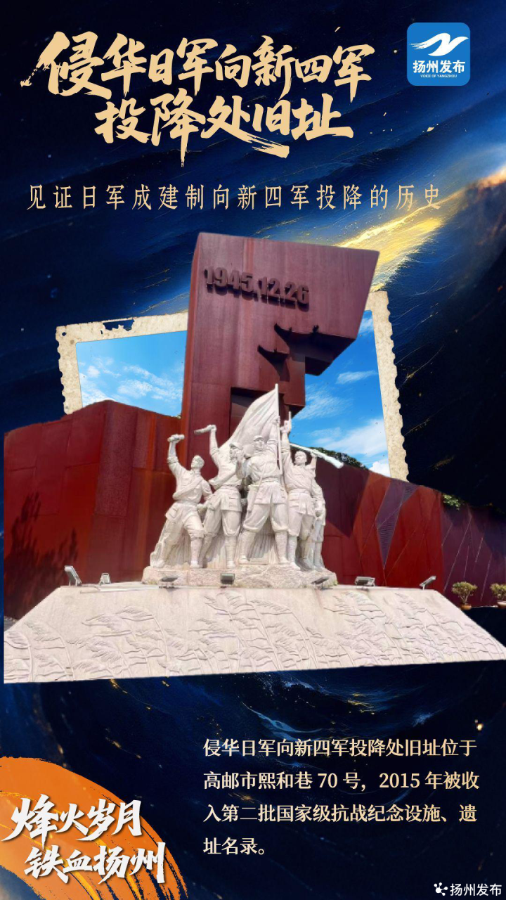 今年是中国人民抗日战争暨世界反法西斯战争胜利80周年。80年过去了,硝烟早已散尽,扬州这片生生不息的土地上,英雄的名字依然铭刻,英勇的故事仍在传颂。为缅怀历史、致敬先烈,7月23日起,扬州发布特别推出新媒体系列报道《烽火岁月·铁血扬州》。编辑部以实际行动践行“四力”要求,派出新媒体编辑,重访战场故地,追寻红色记忆,并采用文、图、视频、海报等结合的全媒体形式,再现古城扬州那段可歌可泣的烽火岁月,敬请关注。