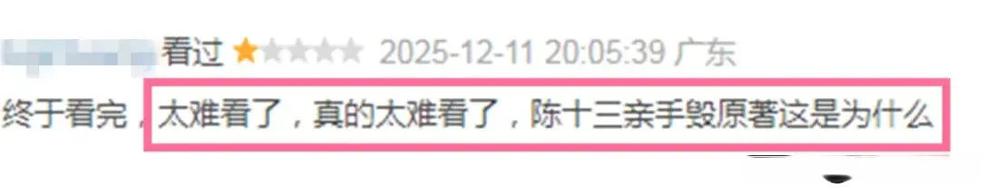 ——“终于看完,太难看了,真的太难看了,陈十三亲手毁原著这是为什么。”